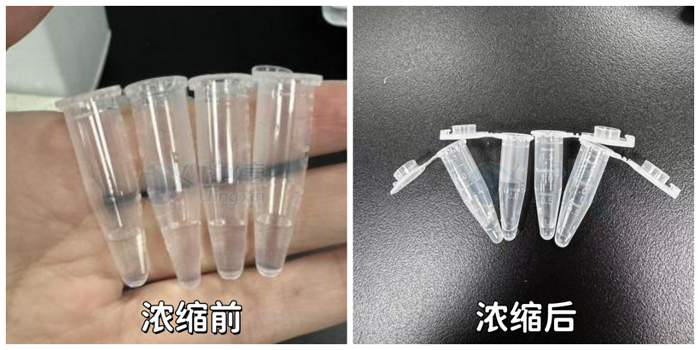 樣品濃縮前(每管200μL),濃縮1小時剩余(53μL,51μL,50μL,49μL)。
